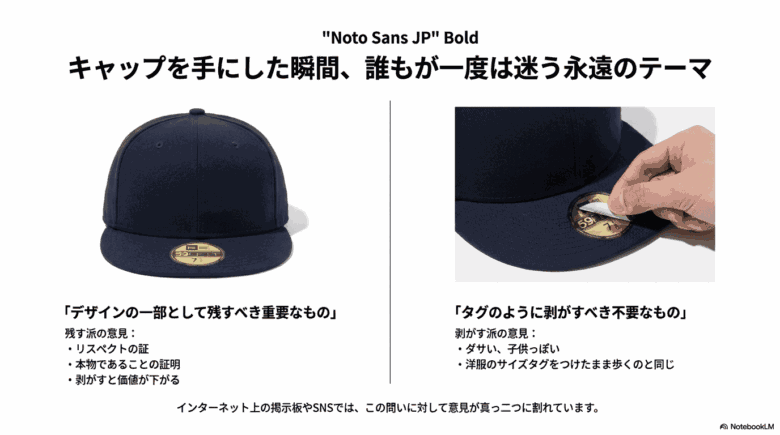 肯定派からは「あの金色があることでニューエラらしさが出る」という声が挙がる一方で、否定派からは「新品のまま被っているようで違和感がある」といった意見が目立ちました 。