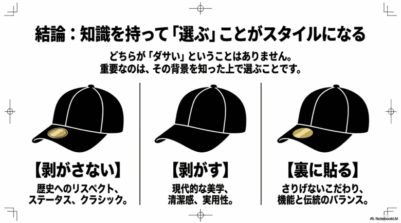 結論として、ニューエラのシール付きキャップを「剥がすか残すか」という問いに、唯一無二の正解は存在しません .